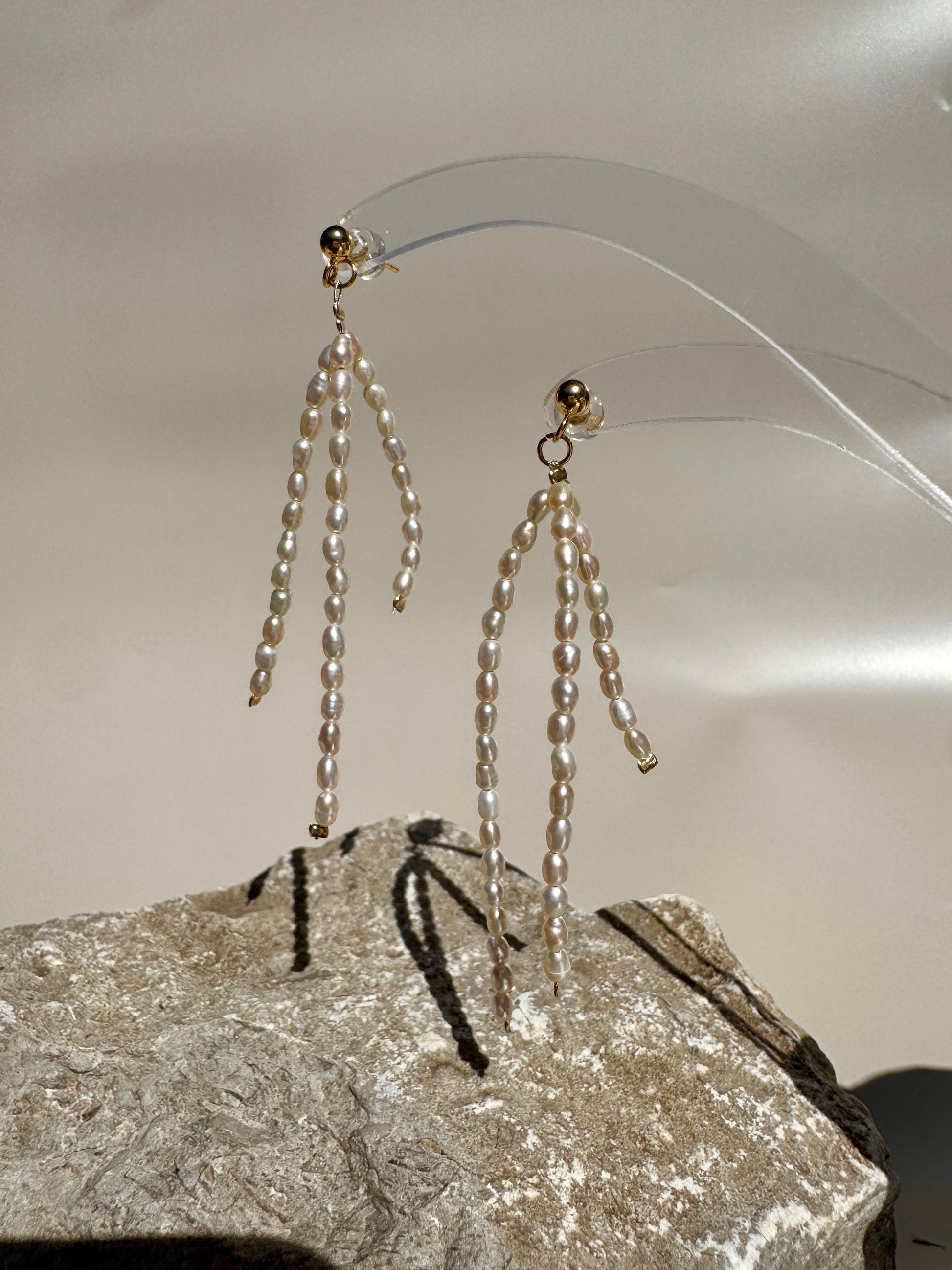 Handmade with delicate strands of natural freshwater pearls, these earrings are designed to flow gracefully with every movement. The cascading silhouette evokes the beauty of waterfalls and the shimmer of starlight, bringing a balance of elegance and drama. Lightweight yet eye-catching, they are perfect for special occasions or adding a sophisticated sparkle to your everyday look.