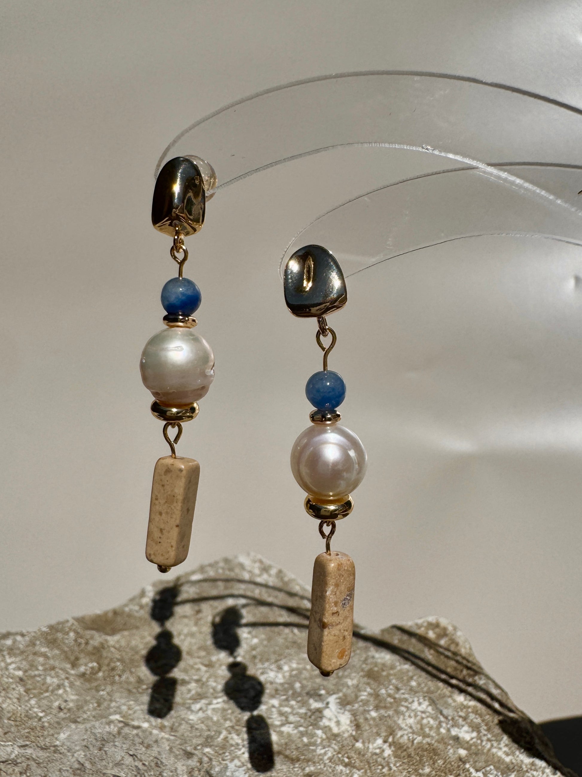 The Earth & Sky Earrings embody a perfect balance of natural elements. Featuring polished gold accents, deep blue gemstones, luminous freshwater pearls, and grounded stone pendants, this design connects the elegance of the heavens with the strength of the earth. A bold yet refined statement piece for those who cherish jewelry with meaning and artistry.
