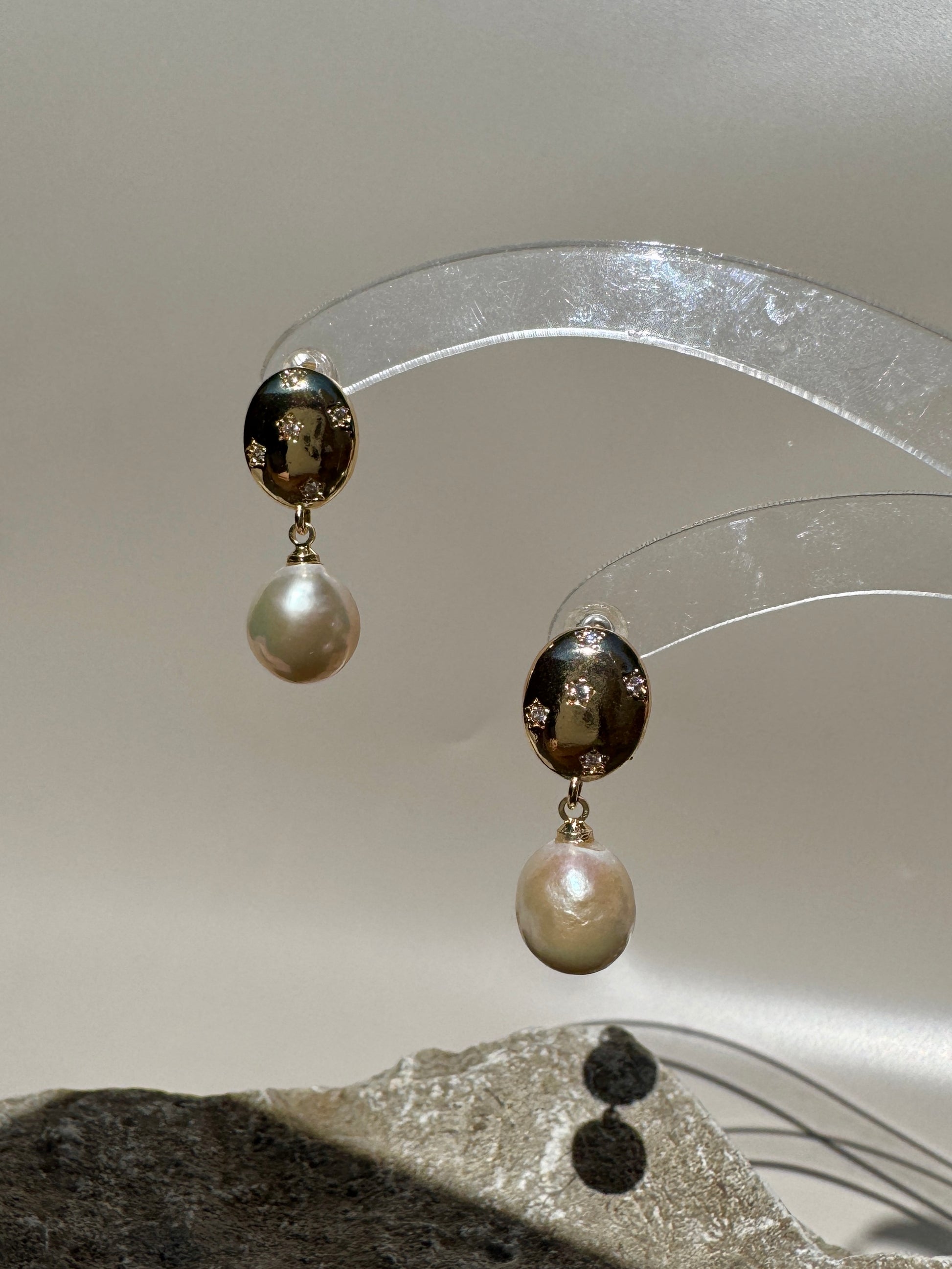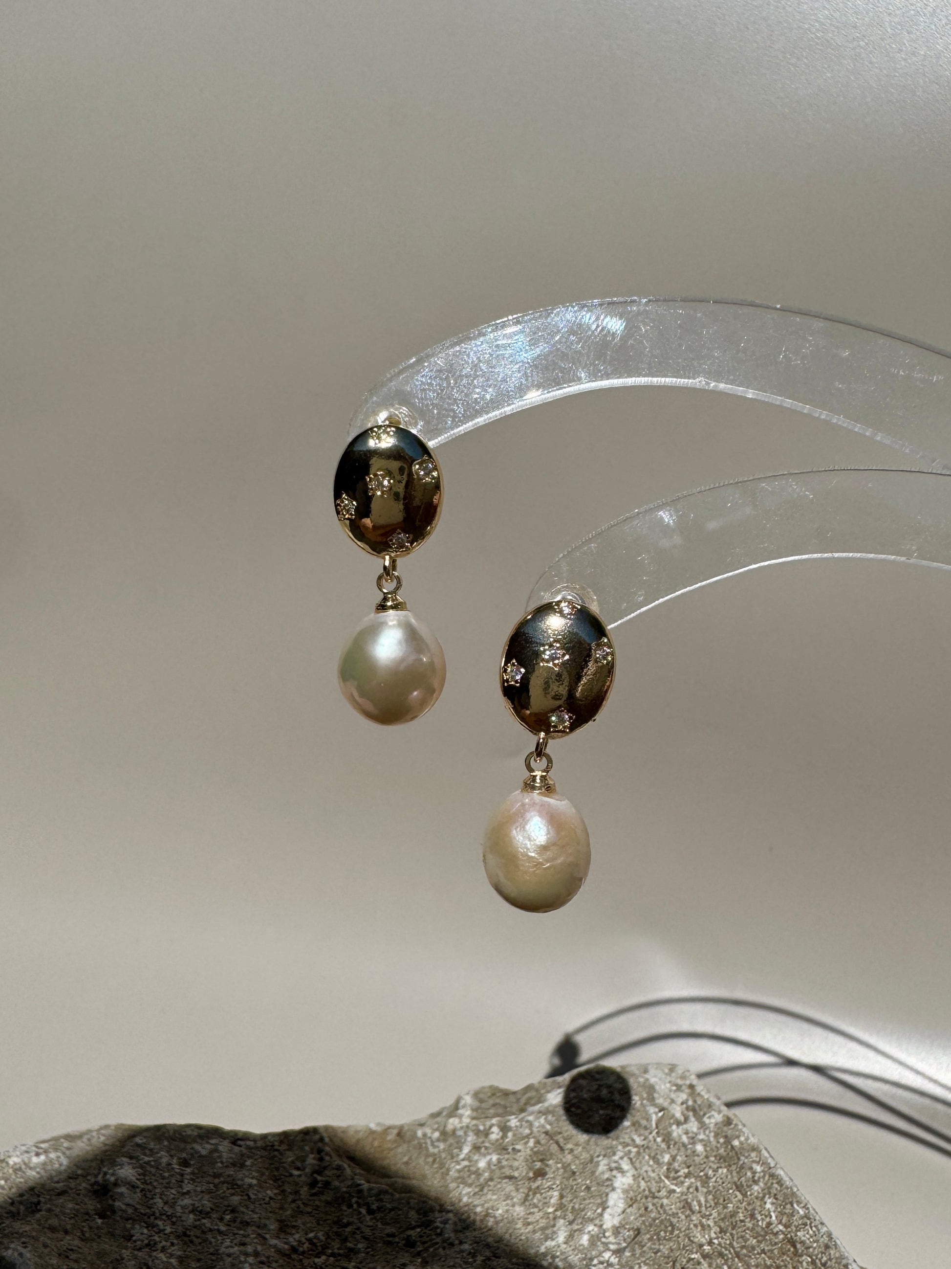 The Starlit Pearl Earrings capture timeless elegance with a touch of celestial charm. Featuring lustrous freshwater pearls suspended from polished golden ovals accented with delicate star-like details, these earrings glow with subtle sophistication. Perfect for evening wear or adding a regal touch to everyday style, they embody both classic romance and modern refinement.