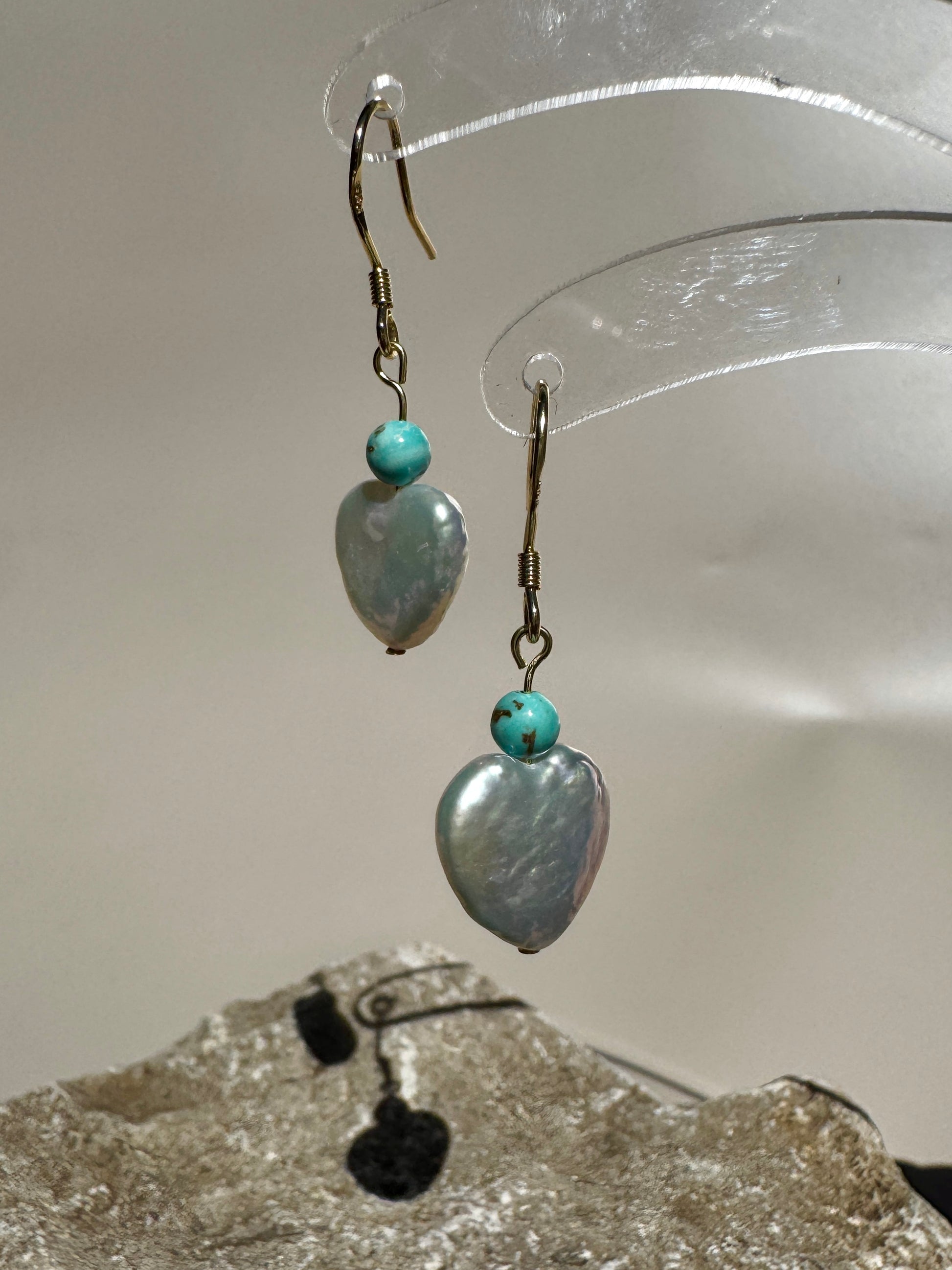 The Ocean Heart Earrings bring together the vibrant energy of turquoise with the timeless beauty of freshwater pearls. Featuring a delicate turquoise bead above a natural heart-shaped pearl, this design feels both playful and elegant, echoing the harmony of sea and sky. A perfect choice for those who love jewelry inspired by nature’s colors and symbols of love.