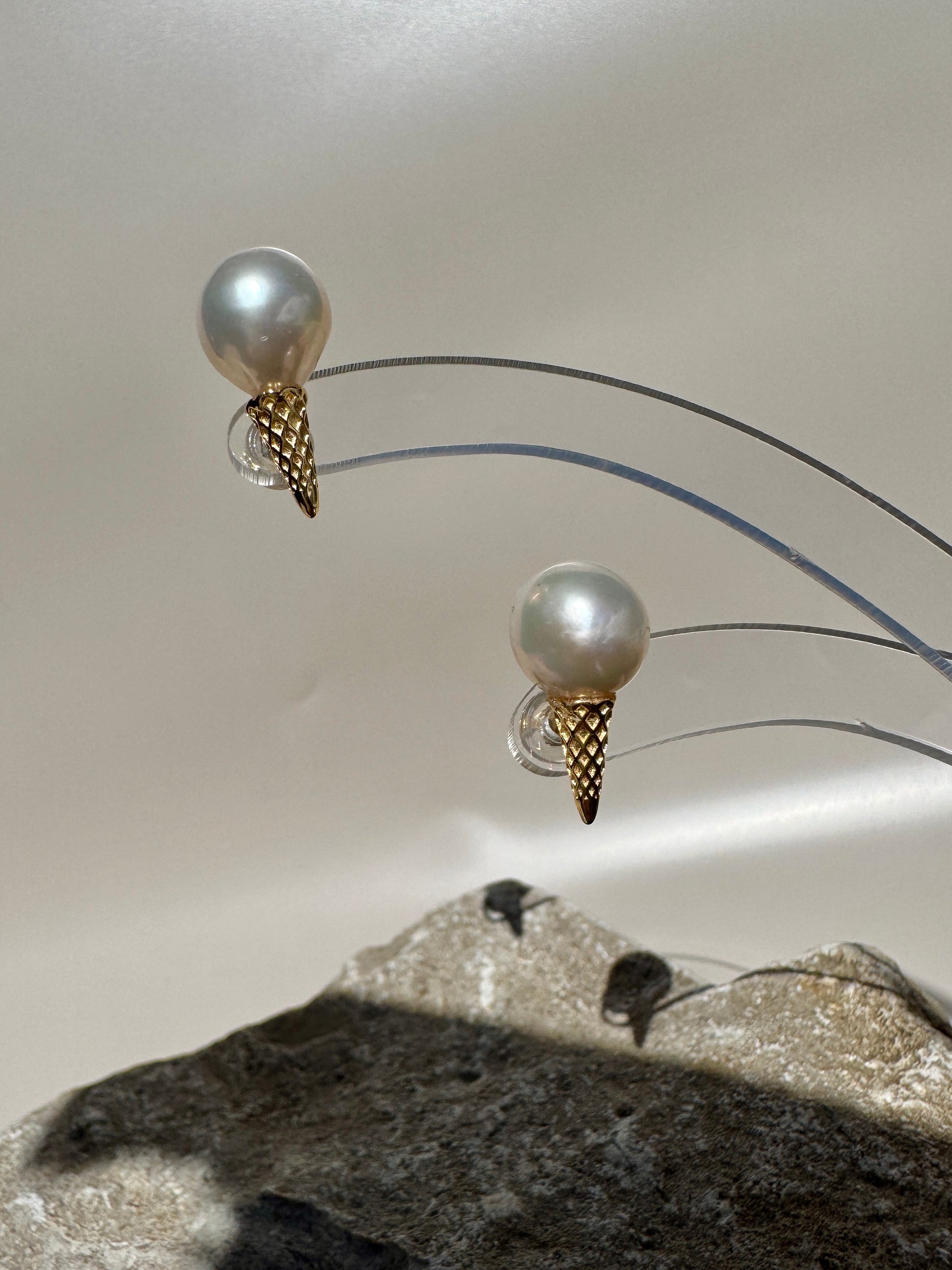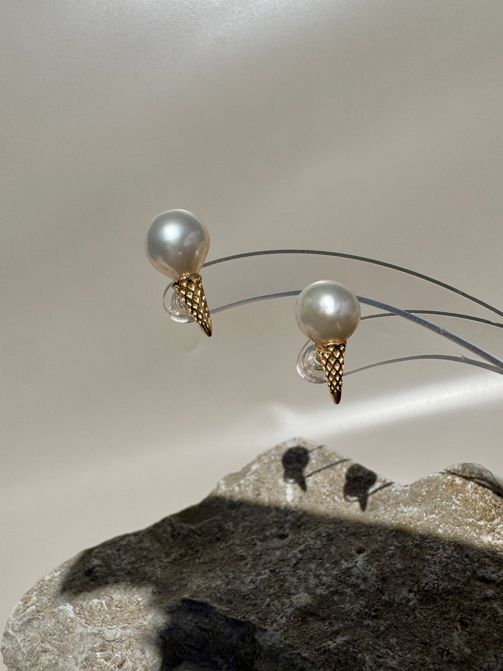 Playful yet elegant, the Pearl Gelato Earrings turn timeless pearls into a delightful treat. Featuring luminous round freshwater pearls set in textured golden cone-like studs, these earrings bring a touch of whimsy to classic design. Perfect for everyday wear or as a conversation-starting gift, they capture the sweet balance of fun and sophistication.