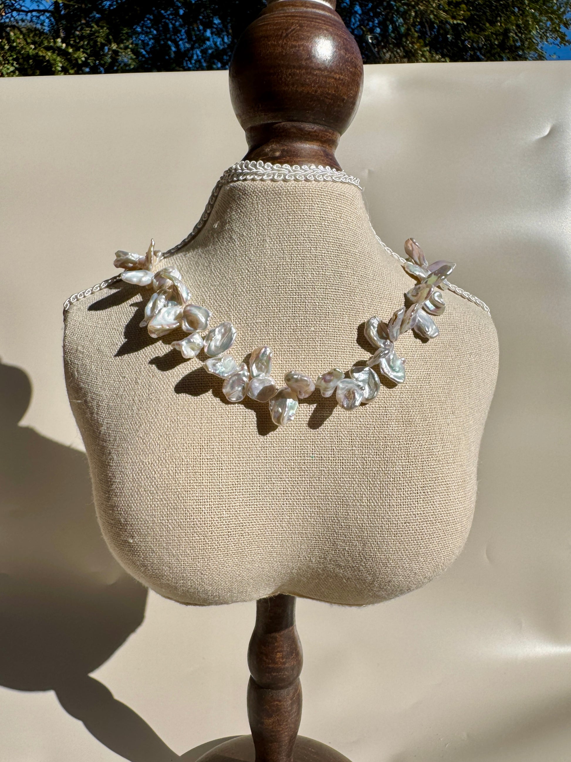 A breathtaking statement necklace featuring layers of natural freshwater baroque pearls, each uniquely shaped to resemble delicate petals. Their iridescent sheen dances with light, creating a soft, organic glow. Handcrafted with care, this design celebrates the natural beauty and individuality of every pearl. Perfect for adding elegance to weddings, evening wear, or as a timeless keepsake, this necklace is both bold and romantic.
